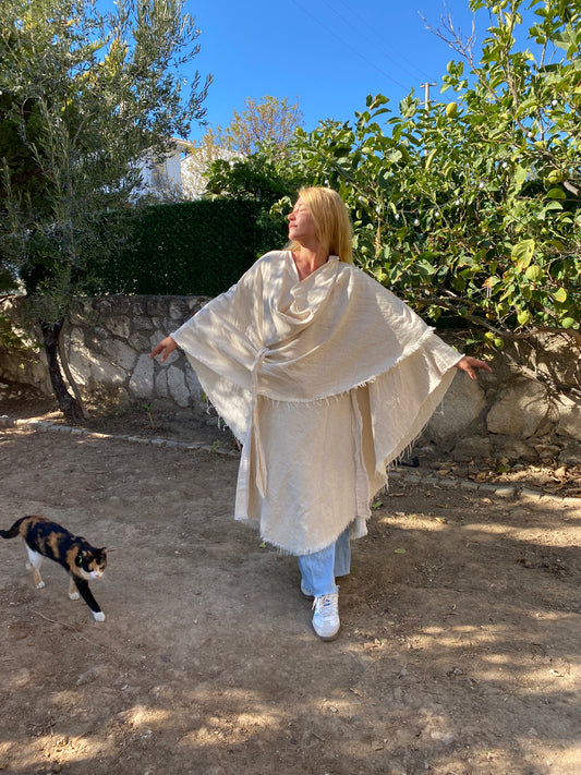 Ahşap Baskılı Yarasa Model Kimono Panço | İki Kat Müslin Kumaş, Krem Rengi | Etnik Desen