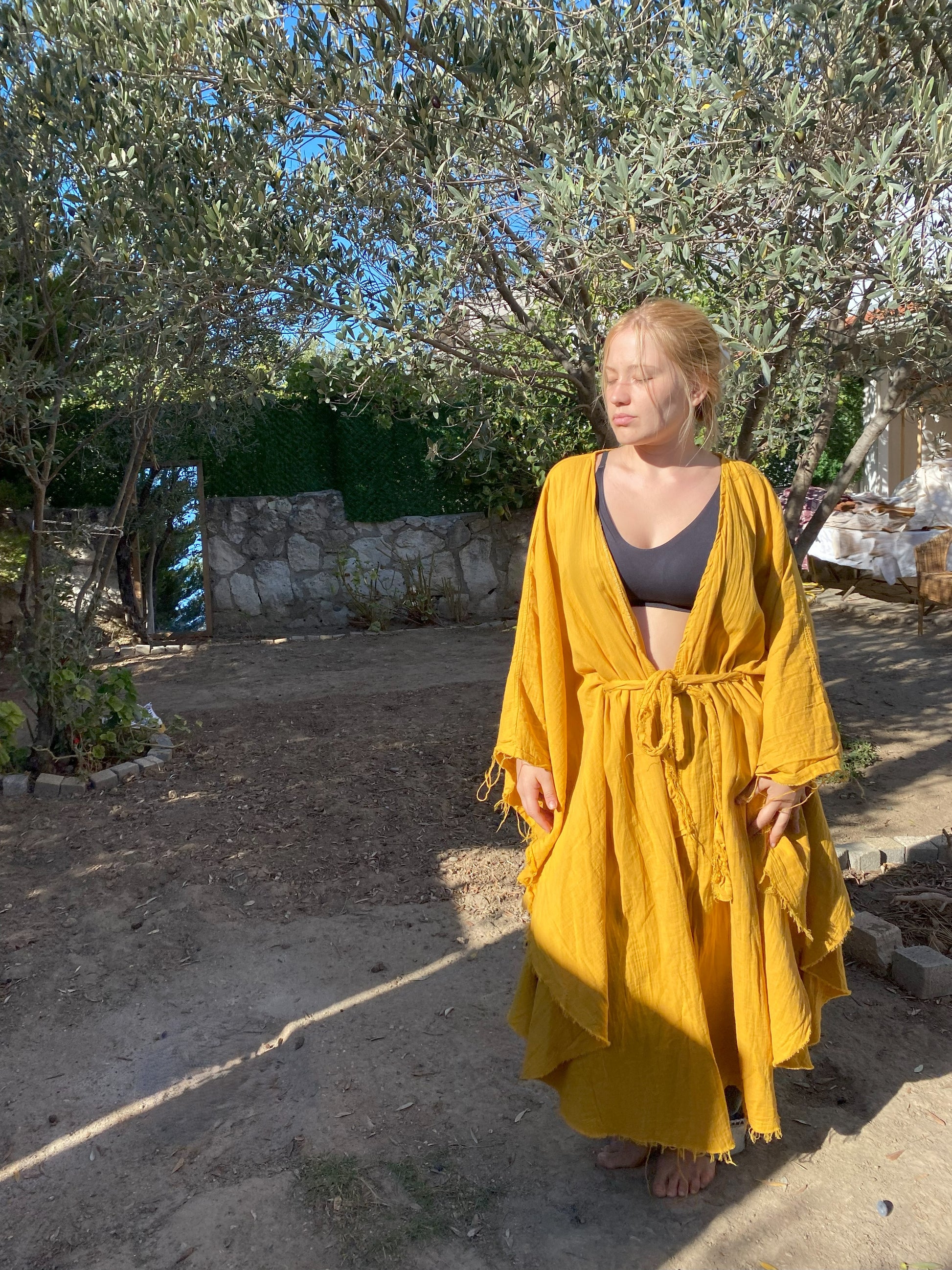 Yarasa Model Kimono Panço | İki Kat Müslin Kumaş Sarı Renk | Dişil Enerji Evreleri Çizimli